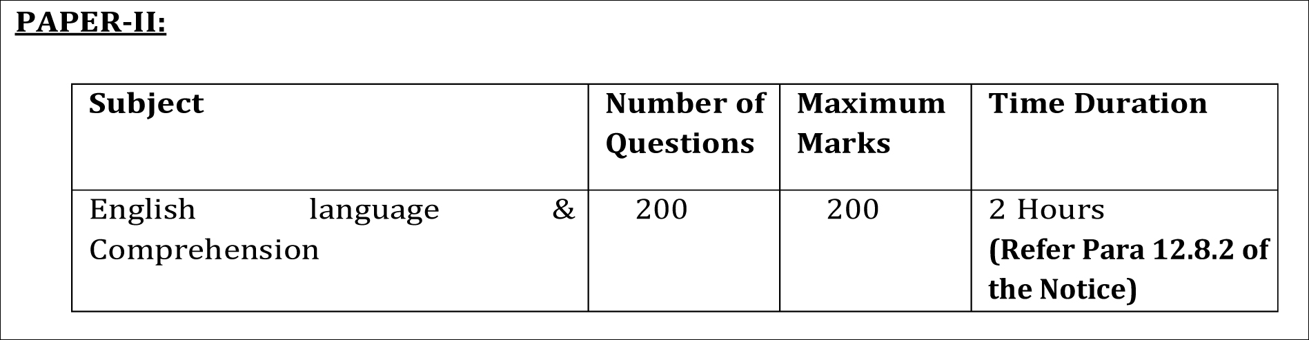 | [पेपर-II]:- कंप्यूटर आधारित परीक्षा (CBT): 200 अंकों का ऑब्जेक्टिव मल्टीपल चॉइस पेपर जो केवल इंग्लिश कॉम्प्रिहेंशन पर आधारित होगा। |